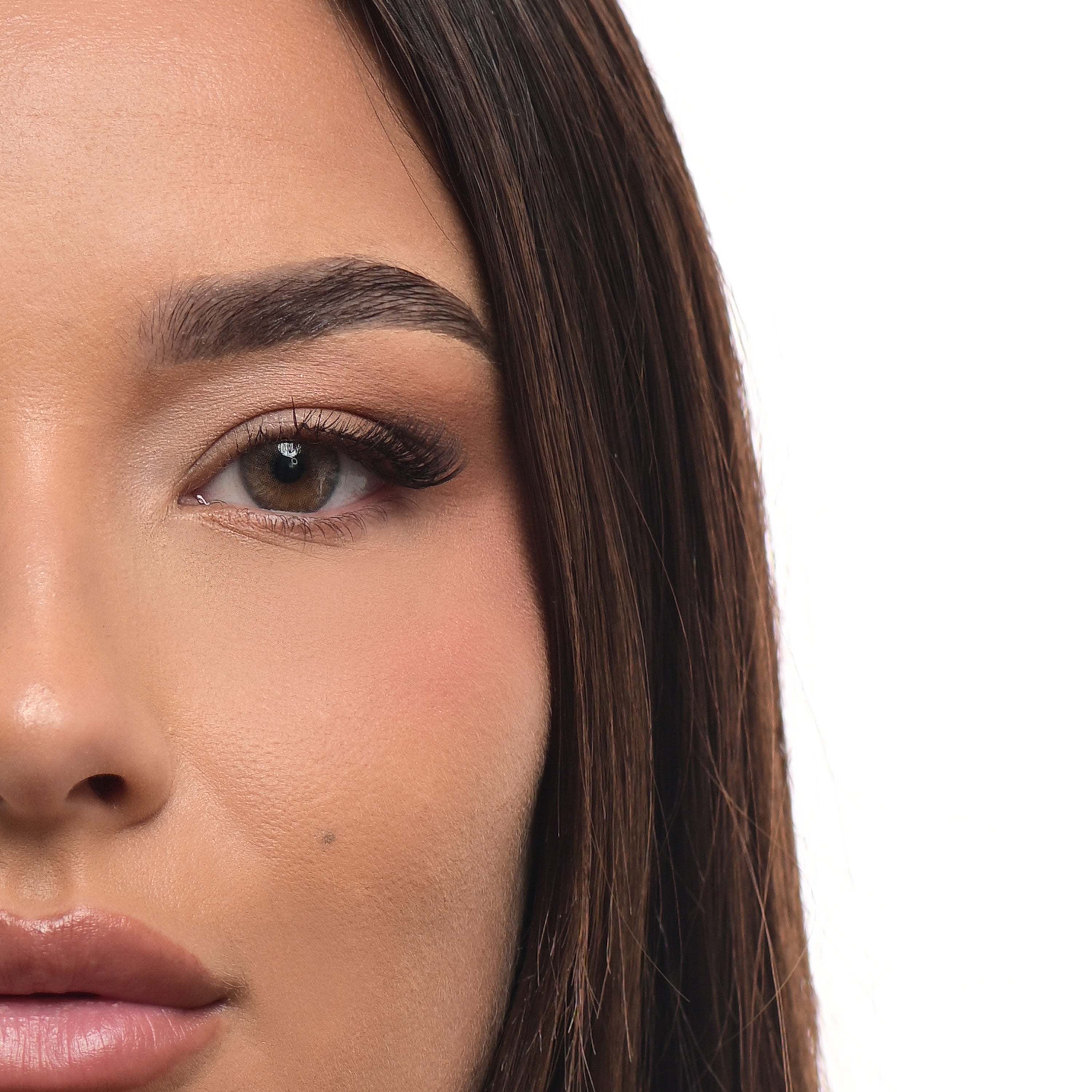 Elle illumine l’iris d’un marron naturel et chaleureux, subtilement mis en valeur par un fin contour bleu régulier.